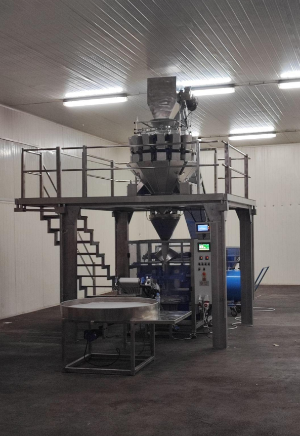 . SELF-STANDING PLATFORM, dimensions: 2500x2000x2200 mm;2. MULTIHEAD SCALE FOR POWDERY AND FINE-GRADED PRODUCTS TYPE 10HFG;3. RECEIVING BASKET WITH SCREW ELEVATOR FOR CONTROLLED DELIVERY OF GOODS TO THE HEIGHT OF THE MULTIHEAD SCALE;4. RECEPTION FUNNEL WITH SILICONE PIPE FOR DIRECTION WEIGHED ITEMS INTO A TUB5. AUTOMATIC PLACEMENT OF TUB ON THE TRANSPORTER TAPE6. TRANSPORT BELT, POSITIONING THE TUB BELOW FUNNEL, VIBRATING THE GOODS IN THE TUB, AND TRANSPORTING THE TUB TO THE NEXT STAGES OF WORK7. MACHINE FOR AUTOMATIC GLUING PVC COVER ON BAG AND INSERTING INERT GAS BEFORE THE LID.8. TRANSPORT BELT, POSITIONING THE TUB BEFORE MOUNTING THE PLASTIC COVER, AND SUBSEQUENTLY PUSHING THE LID ON THE TUB9. CHANGER FOR AUTOMATIC LID PUTTING ON TUB.10. PNEUMATIC PRESS FOR POST-ATTACHING THE COVER TO THE TUB11. ROTO TABLE FOR RECEIVING AND ACCUMULATING PACKAGED PRODUCTS READY FOR PACKAGING INTO COLLECTIVE TRANSPORT BOXES